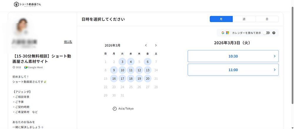 (カレンダー画面キャプチャ:空き日時選択→名前・メール入力)